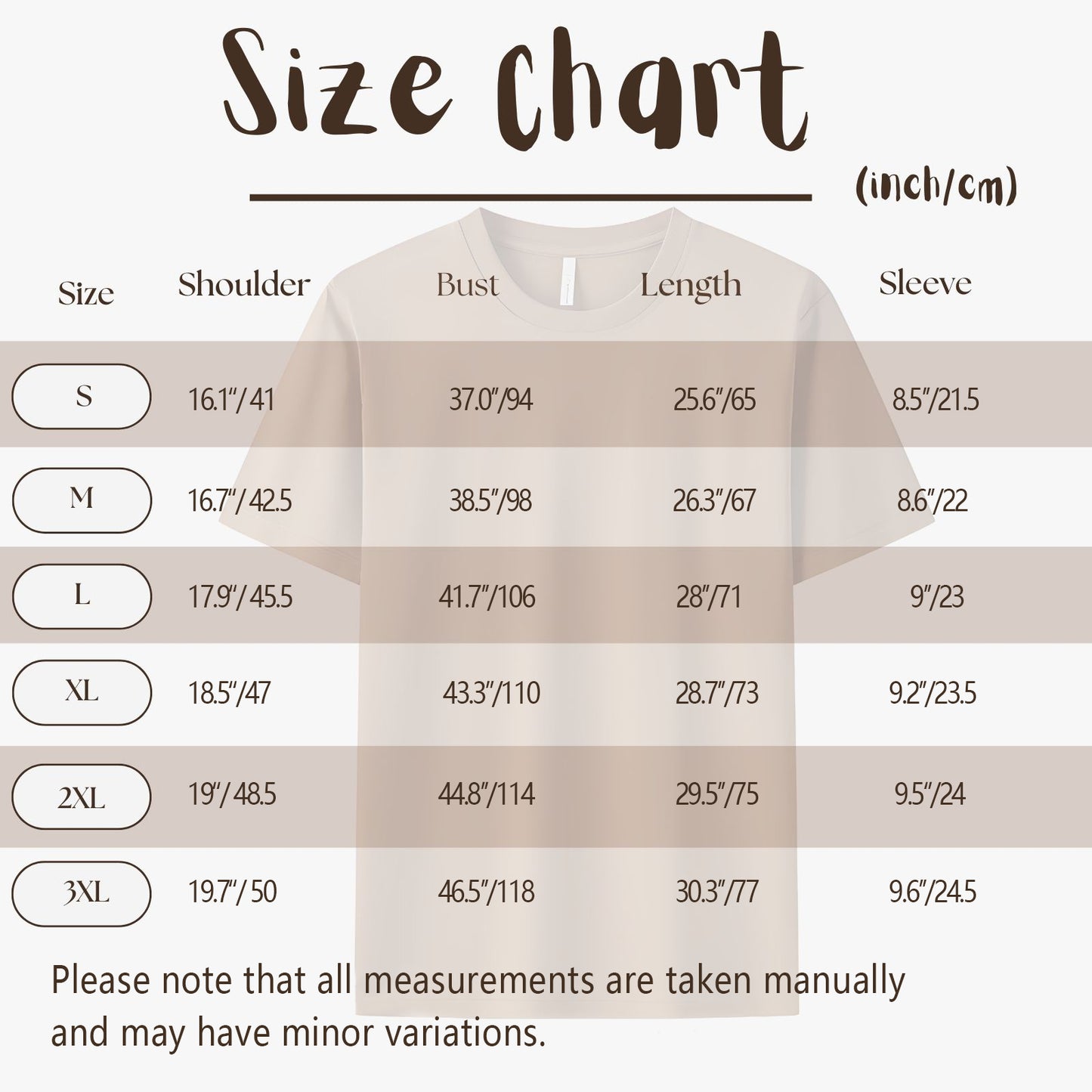 Measurements are taken from the laid-flat garment. A 2-4cm variance is normal due to different measuring methods. |